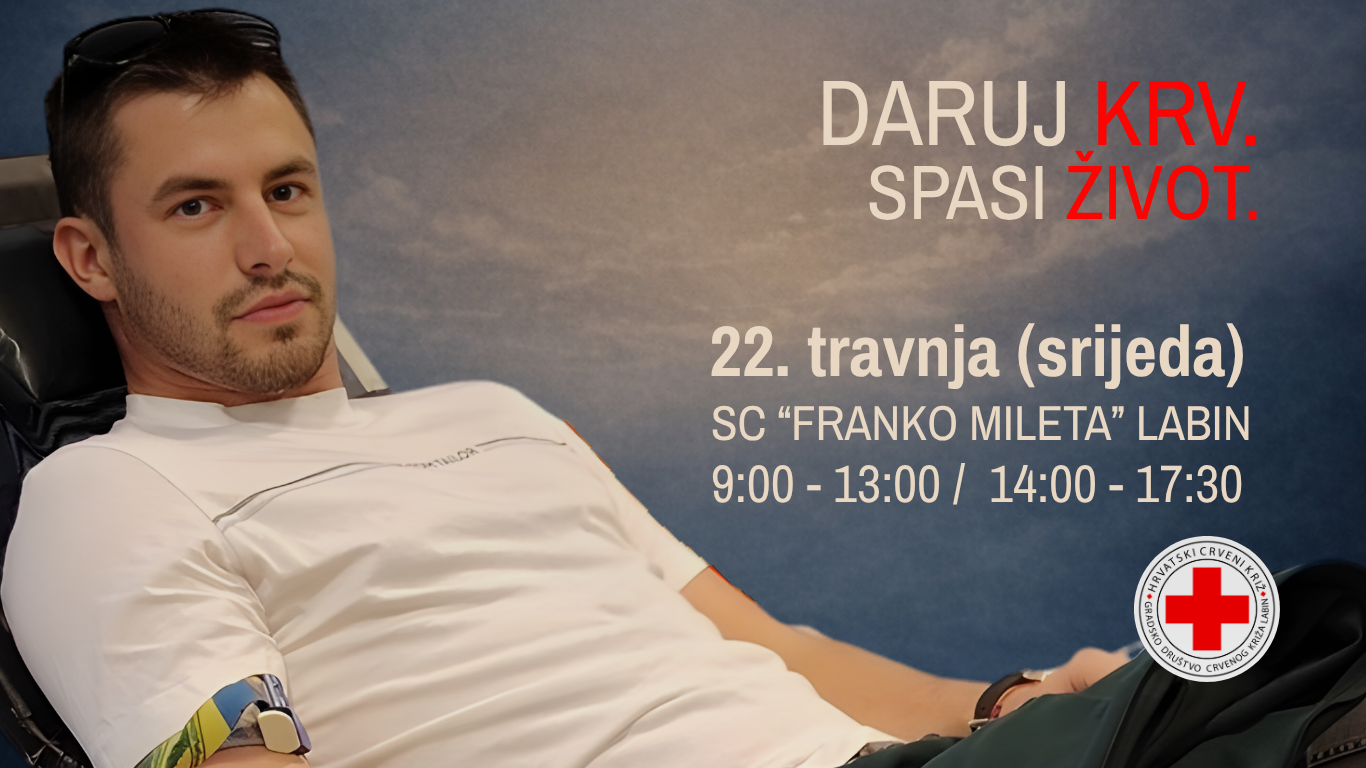 Pozivamo sve naše darivatelje na akciju darivanja krvi koja će se održati u srijedu, 22. travnja 2026. godine od 9,00 do 13,00 sati te od 14,00 do 17,30 sati u SC “Franko Mileta” Labin.